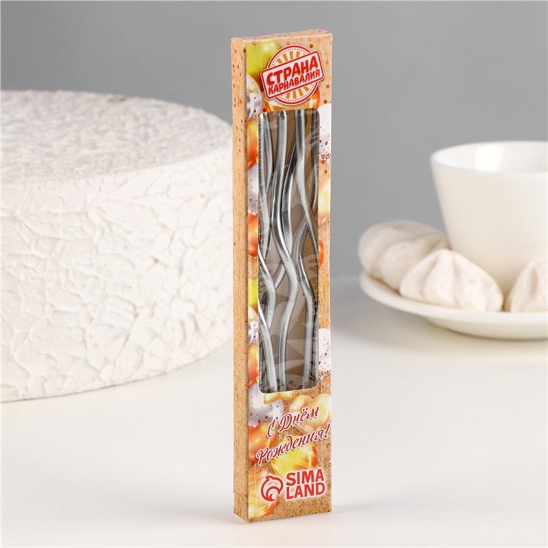 Свечи для торта "Серпантин" 6 шт, коктейльные, серебро, 15,5 см